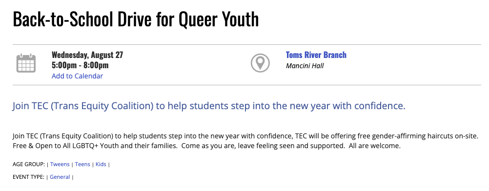 Last week, the Toms River Branch of the Ocean County Library System hosted an organization offering “free gender-affirming haircuts on-site” to “[a]ll LGBTQ+ Youth and their families.” The library specifically tagged the event for kids, tweens and teens.
