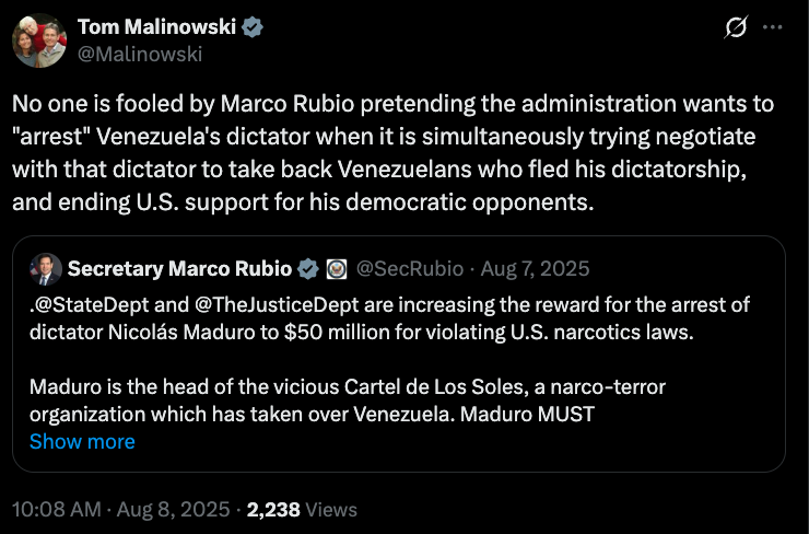 But as recently as August 2025, Malinowski insisted with his characteristic unearned confidence that the Trump Administration was “pretending” to show interest in arresting Maduro: